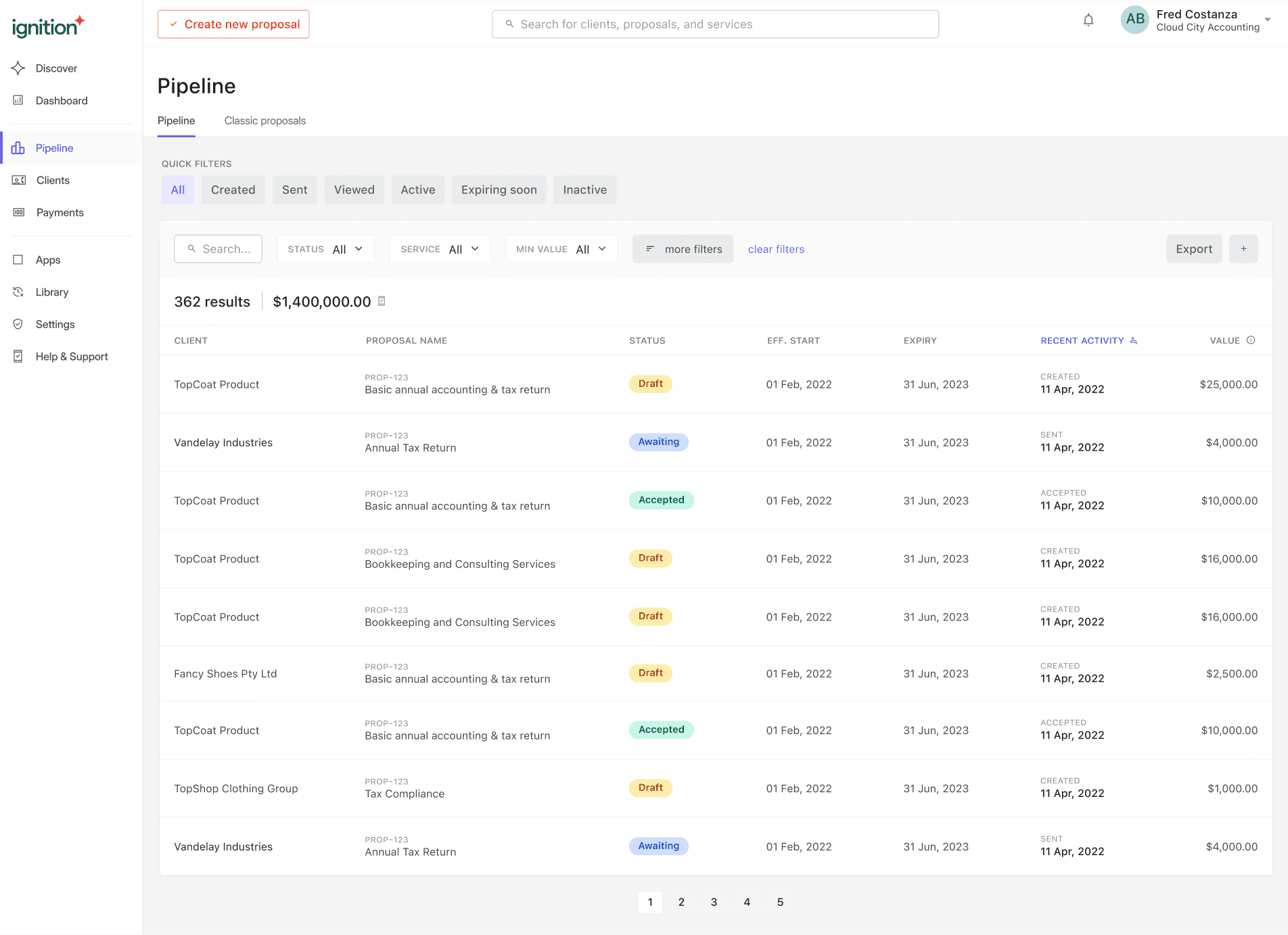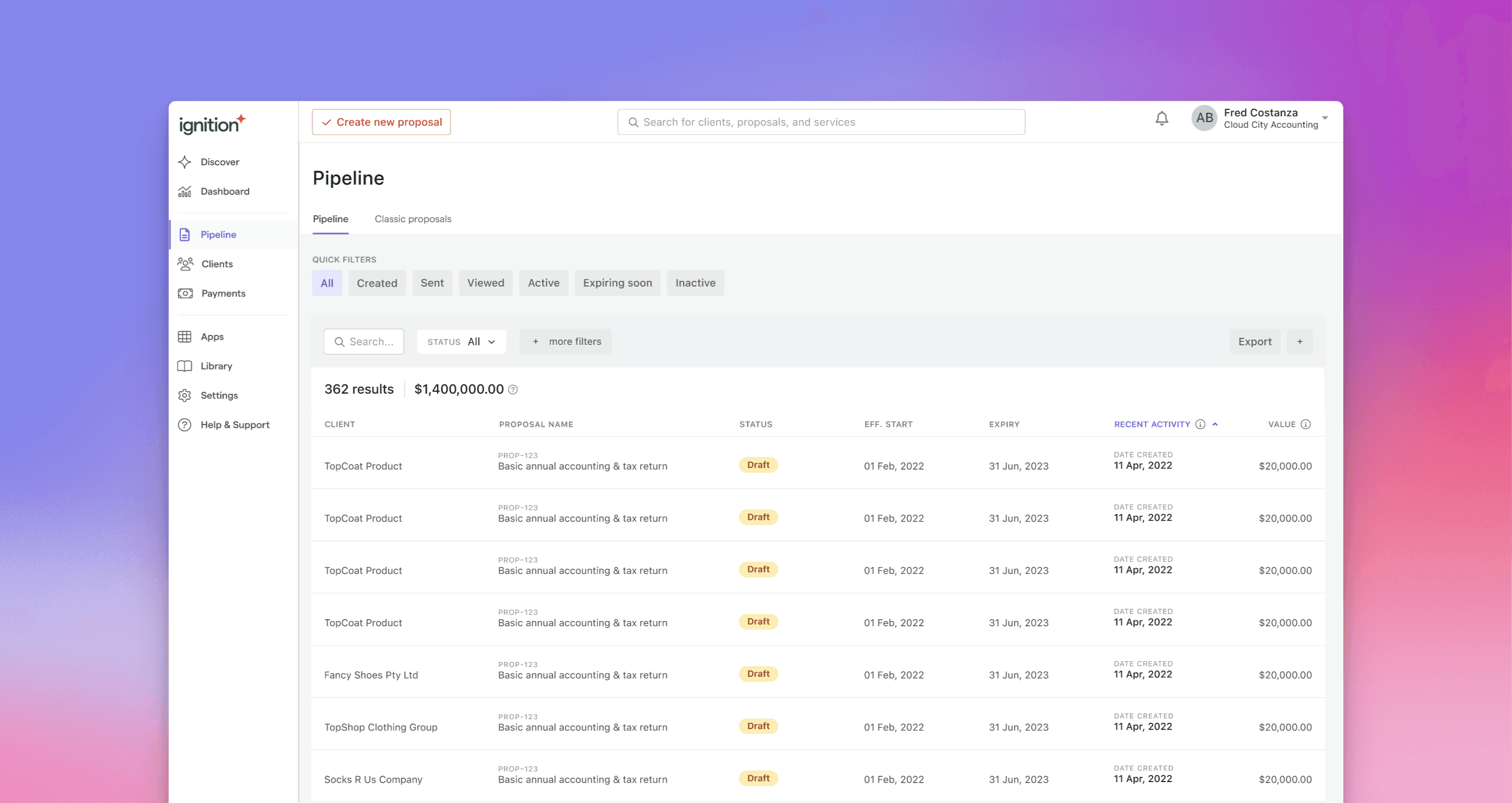 I led the design of Ignition’s answer, a sales pipeline that gave customers visibility and spurred action. The result? A 52% increase in accepted proposals.
